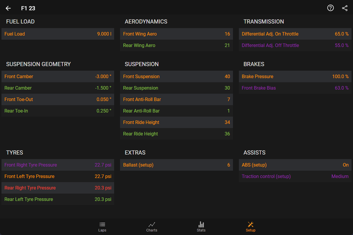Session Laps - the complete list of recorded laps, selecting one lap you can access the detailed telemetry data (including charts, track views, the comparison mode and many other features).